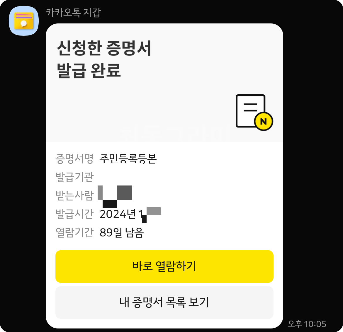 카카오톡 지갑 기능 덕분에 개인 정보를 카카오톡에 모두 등록할 수 있어 이런 정보 발급하기가 너무 편리해진 것 같아요.