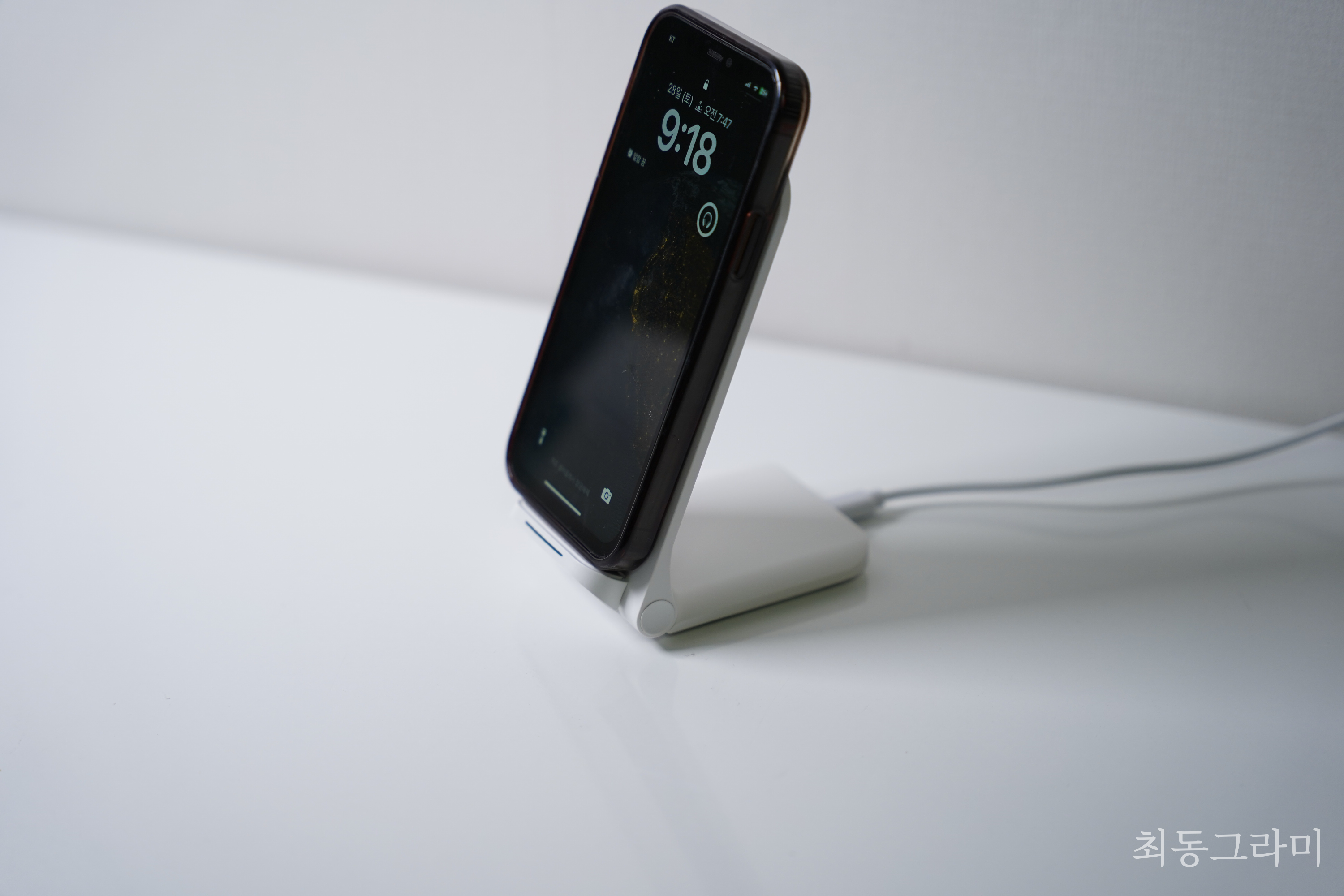 전원을 연결하면 하단에 충전 상태를 알 수 있는 LED가 점등된다. 스탠드 부분은 듀얼 코일이 탑재되어 있어서 세로로 세워서는 물론 가로로 눕혀서도 충전이 가능하다. 그래서 회사 점심시간 등 쉬는 시간에 영상 시청하기도 꽤나 좋았다.