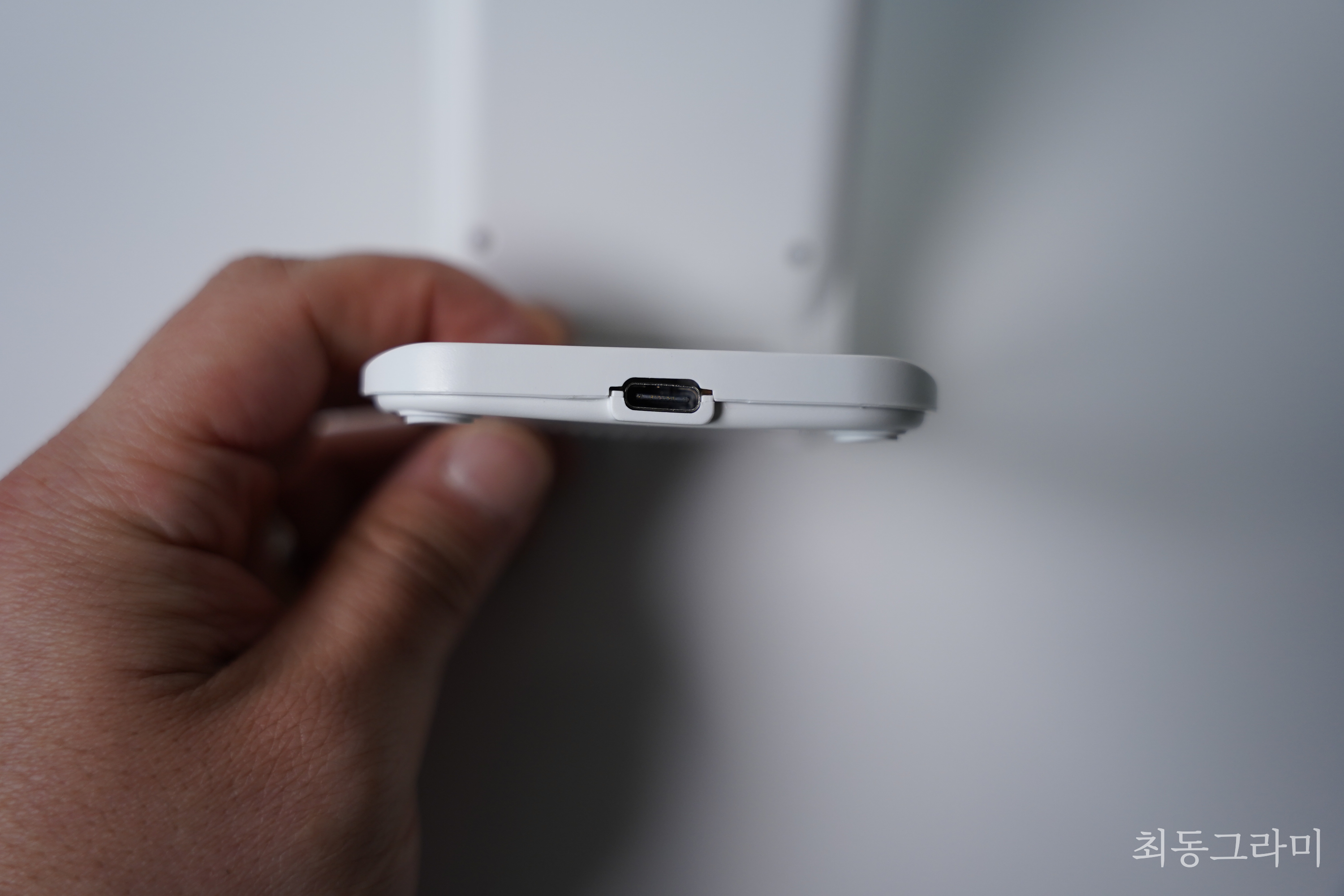 전원은 C타입 포트로 연결 가능하며, 최대 15W 고속 무선 충전기 가능하다. 무선 충전 제품이기 때문에 아이폰, 갤럭시 구분 없이 무선 충전을 지원하는 모델이라면 모두 사용 가능하다는 점도 장점이다.