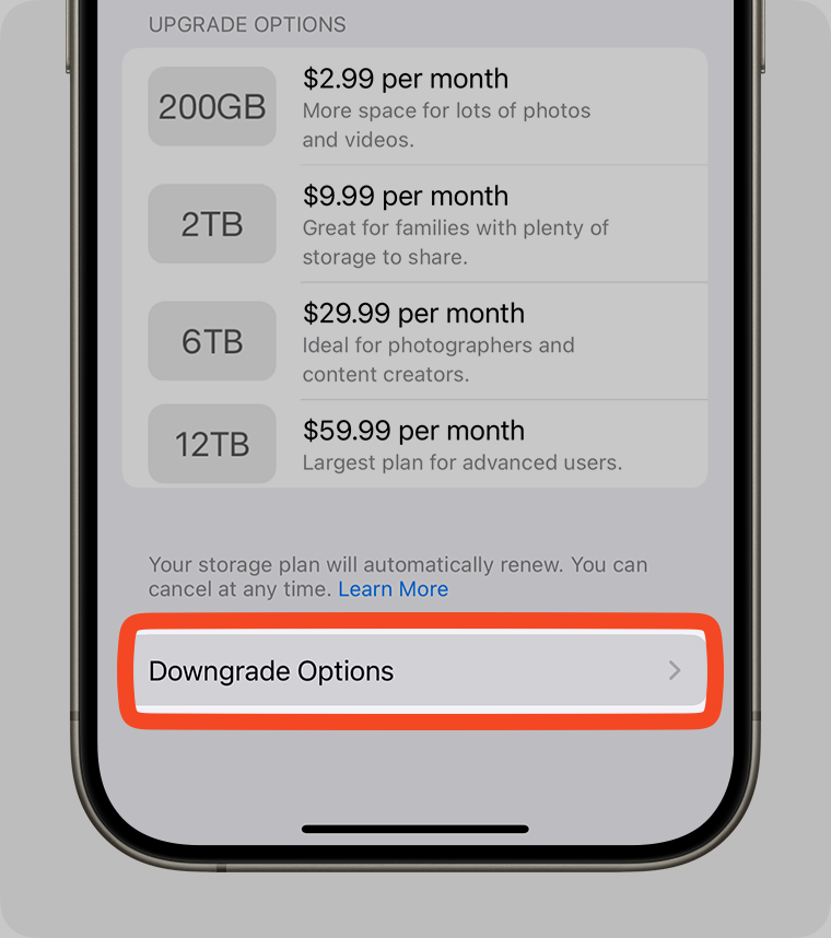 아이클라우드+를 사용하다가 구독 해제 하는 방법은 다시 아이클라우드+를 클릭하여 'Downgrade Options'를 클릭하면 무료 버전인 5GB로 변경된다.