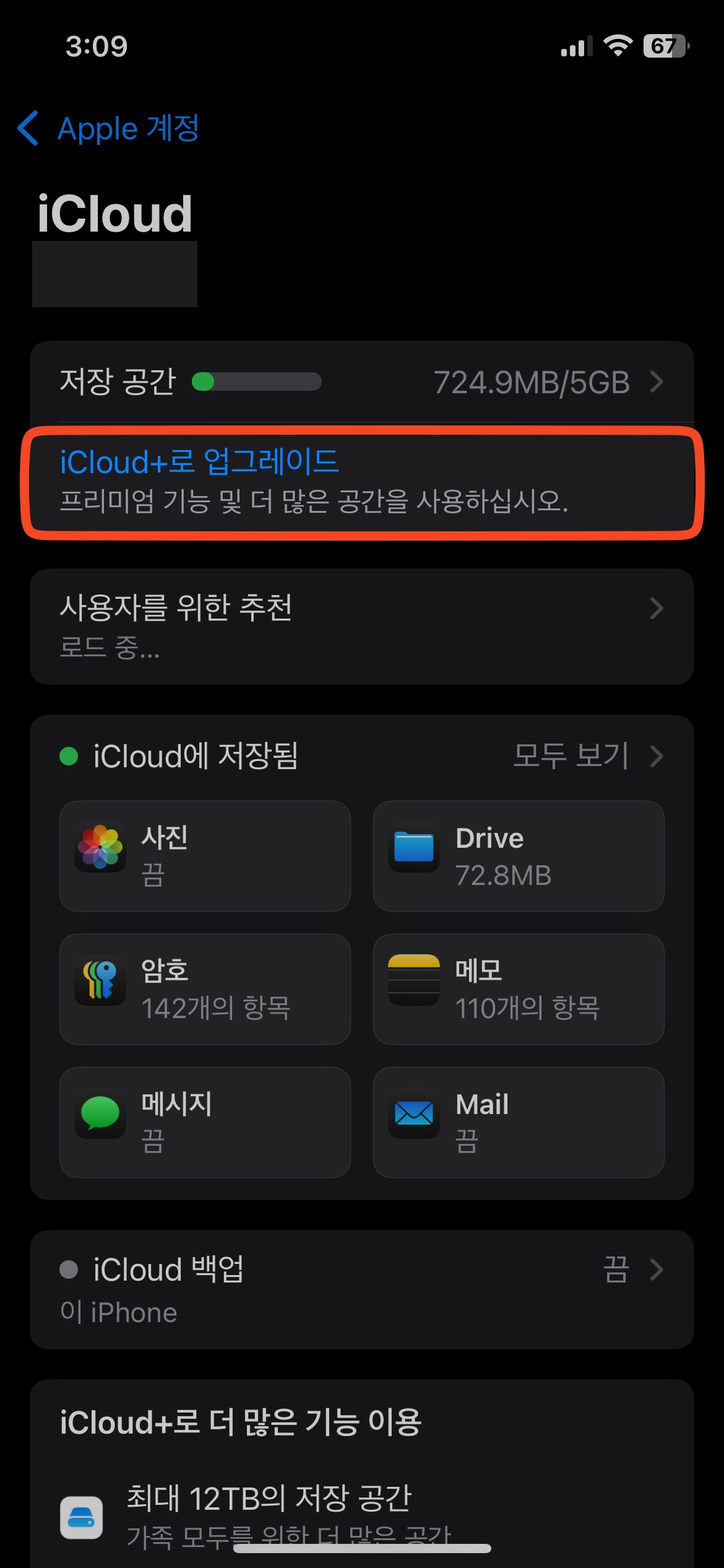 아이클라우드 메뉴로 들어오면 아이클라우드 내 내가 올린 정보가 표시되어 있는데, 용량 업그레이드를 위해서는 iCloud+로 업그레이드 버튼을 클릭한다.