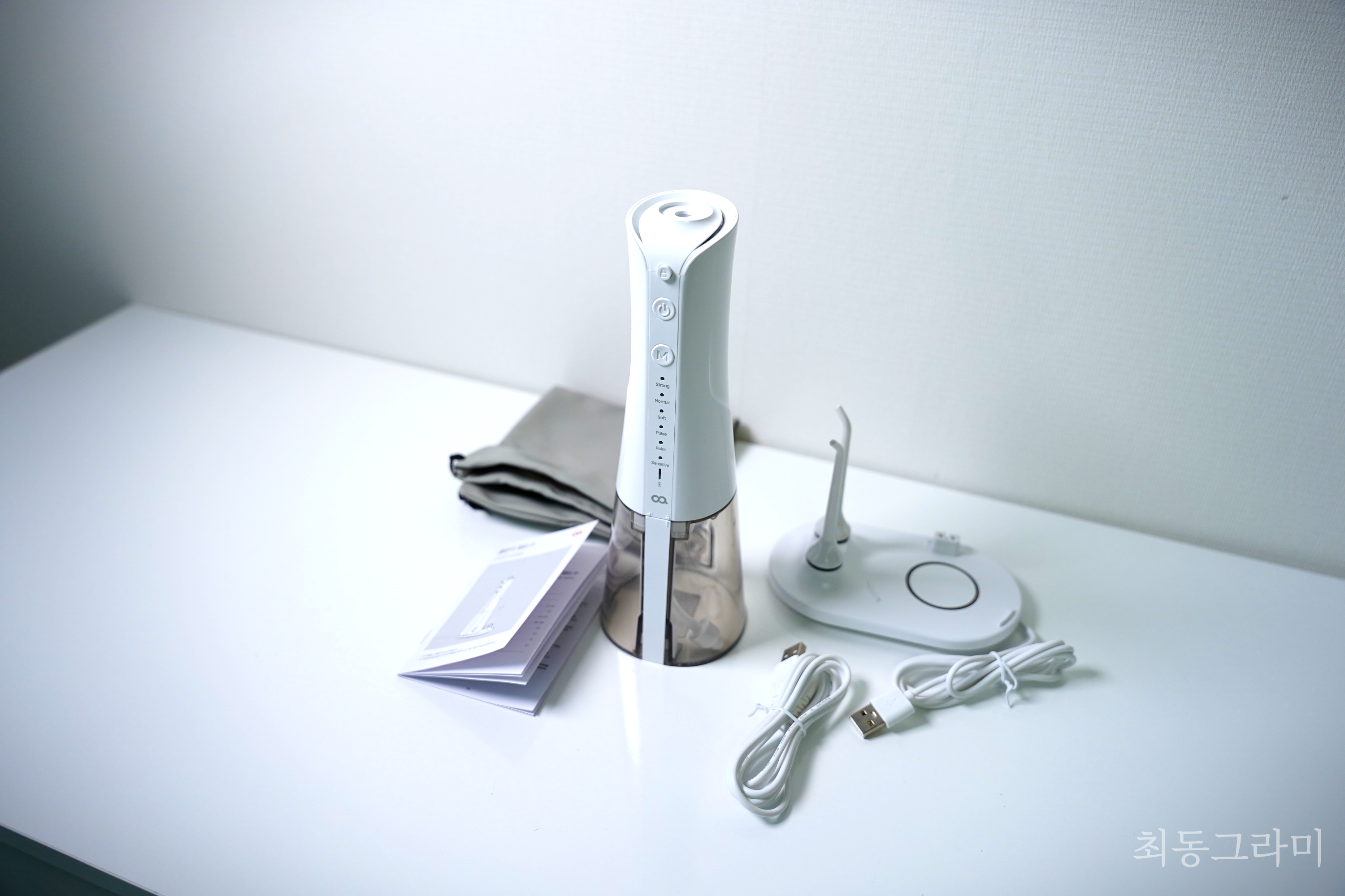 제품 구성은 본체, 무선충전기, 노즐, 충전 케이블, 파우치로 구성되어있다. 파우치는 방수 기능이 있는 파우치라 멀리 출장 갈 때 챙겨가도 내부에 있는 물기 때문에 가방 안이 젖을 걱정이 없을 것 같았다.
